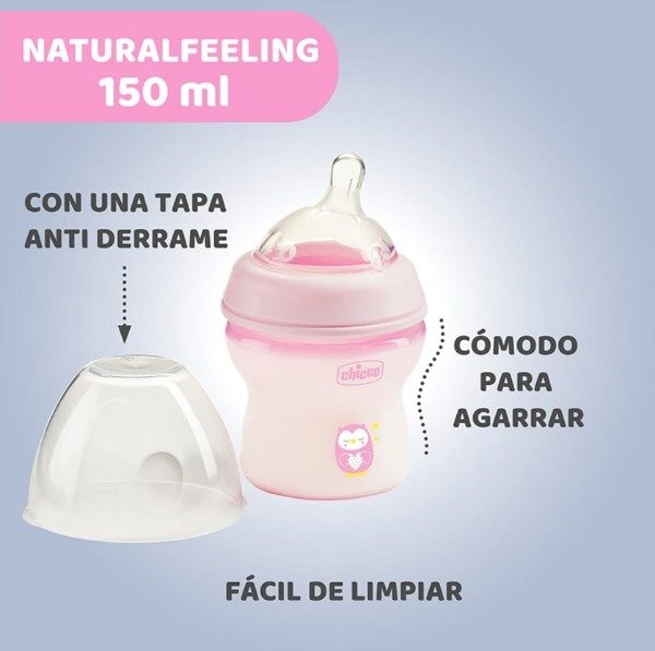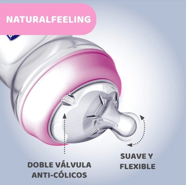Biberón NaturalFeeling 2m+, único con tetina inclinada de silicón suave con “Mum effect” y doble válvula anticólico. Promueve la correcta postura del cuello del bebé al alimentarse, disminuye riesgo de cólico e ingesta de aire y su diseño simula el seno materno para que la transición del pecho al biberón sea lo más natural posible.