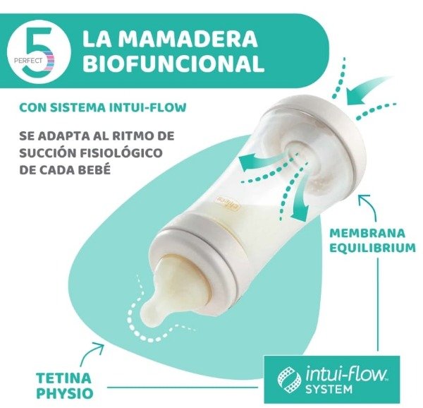 La mamadera anticólicos 150 ml Perfect 5 para recién nacido Chicco se adapta al ritmo biológico de cada bebé, cubriendo sus necesidades de succión. Además, debido a su sistema intui-flow® patentado por Chicco y su Membrana Equilibrium, el biberon se ajusta a los micromovimientos de cada succión, moderando la intensidad y el flujo de la leche, mientras reduce el volumen de aire que provoca cólicos.