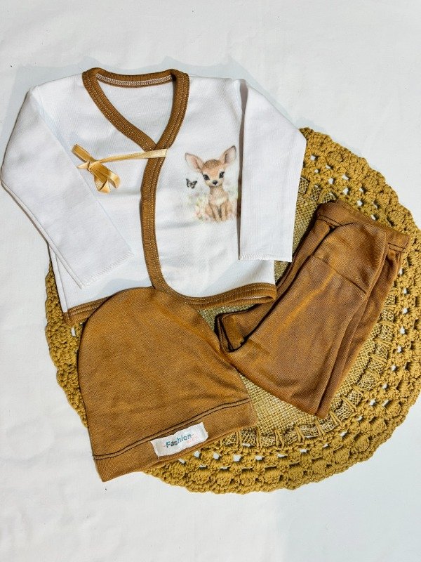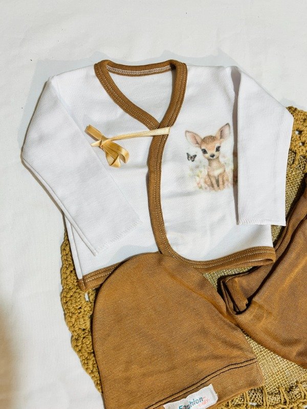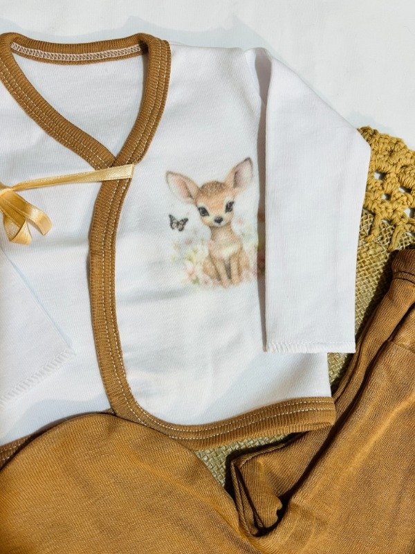 Incluye batita con lazos, medio osito y gorrito. Sublimado de ciervo con flores.
