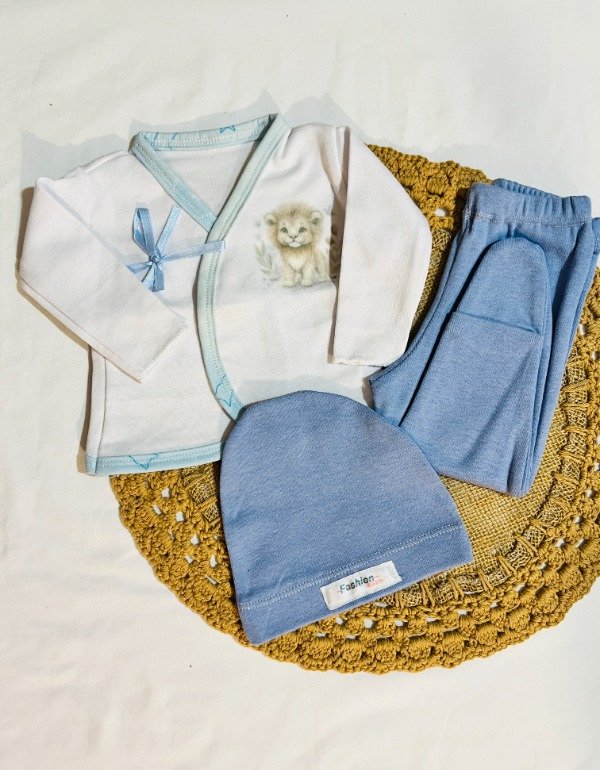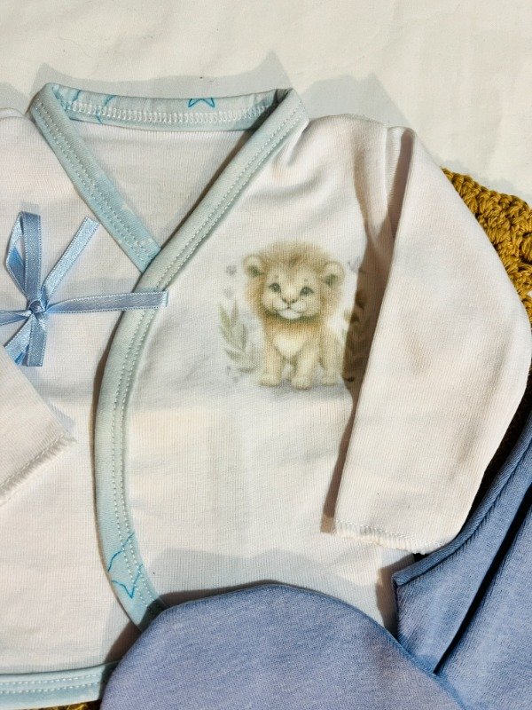 Incluye batita con lazos, medio osito y gorrito. Sublimado de león.
